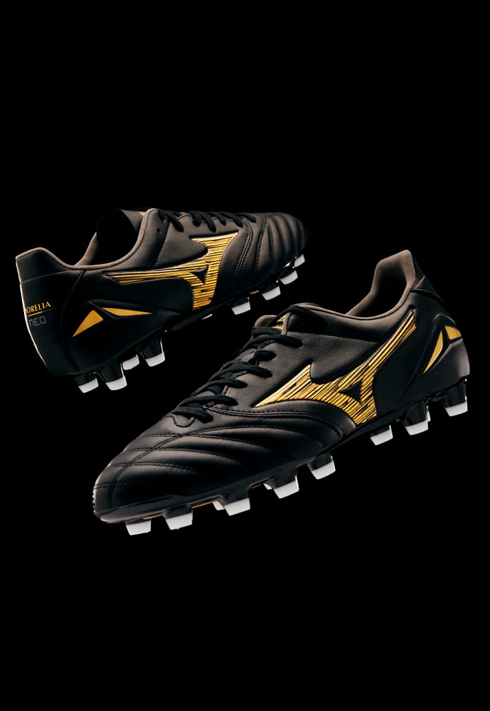 Ramping up the appeal to the grassroots game, Mizuno have launched the ‘Aurum Pack’, wrapping the Morelia Neo IV β, Morelia Neo IV, and Morelia II in black coats with golden embellishments.