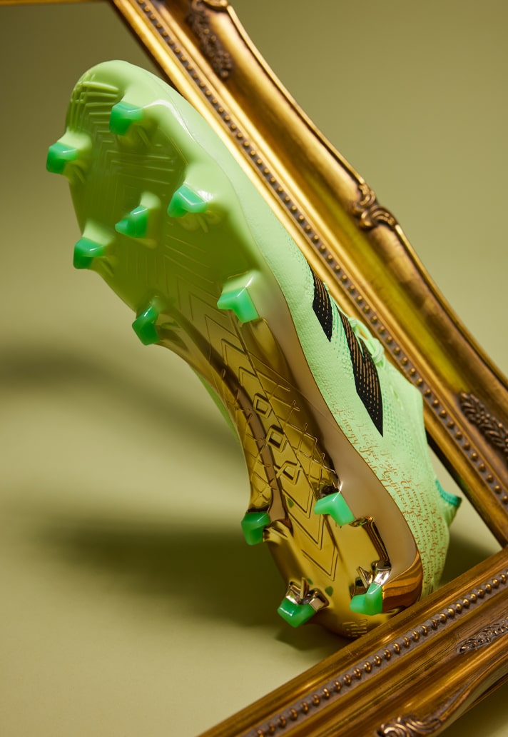 The boots arrive in a vibrant Lime Glo colourway that follows on from New Balance’s current on-pitch pack, and that’s combined with a striking Gold soleplate. The heel features a new elevated heel graphic paired with premium electroplated tooling treatment and personalised heel foxing, adding texture and colour to the boot.