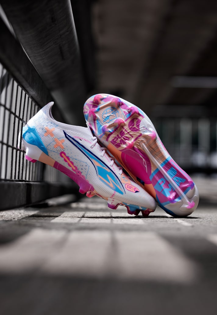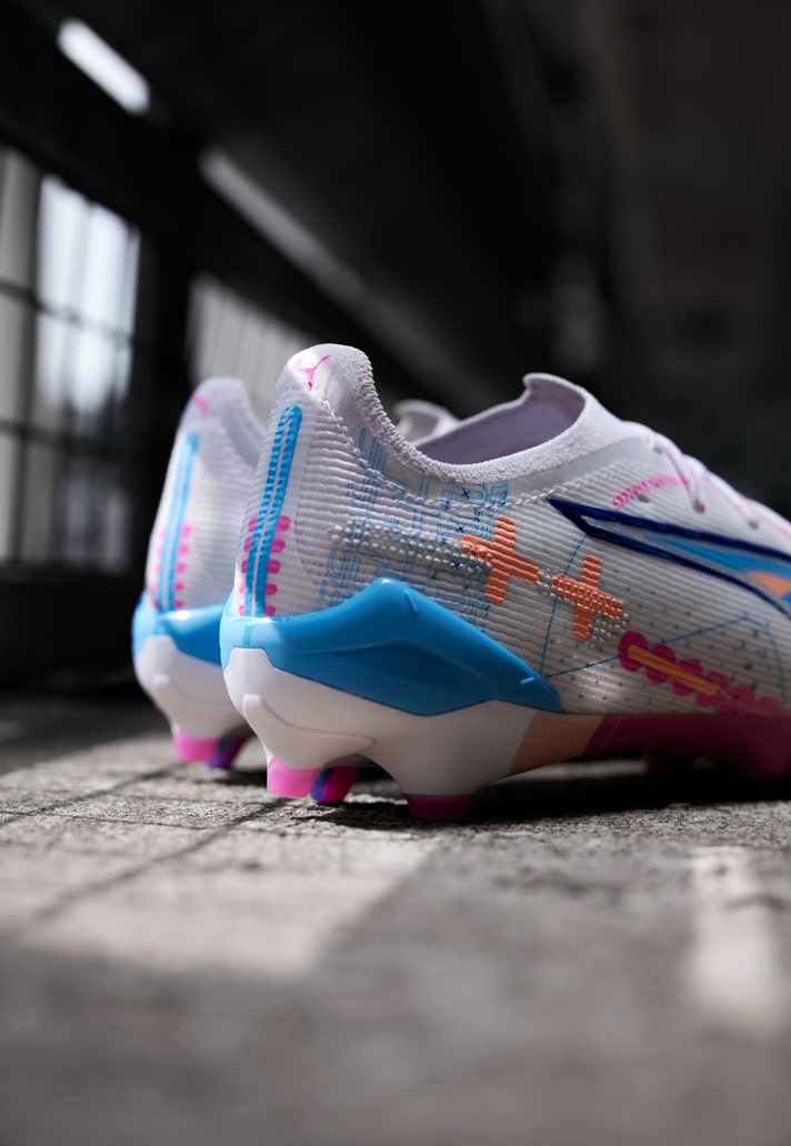 The Ultra 5 is the new boot on the block for PUMA, having recently been updated. Although you won’t find the special ‘Carbon’ edition here, you still get the SPEEDSYSTEM outsole design combined with the revolutionary FastTrax stud system. It’s presented in a “Puma White/Luminous Blue/Poison Pink/Fizzy Melon” colourway which, like the Future, sees a white base with the colours and graphics splashed across it. Unlike the Future though, pink is the more prominent colour here.