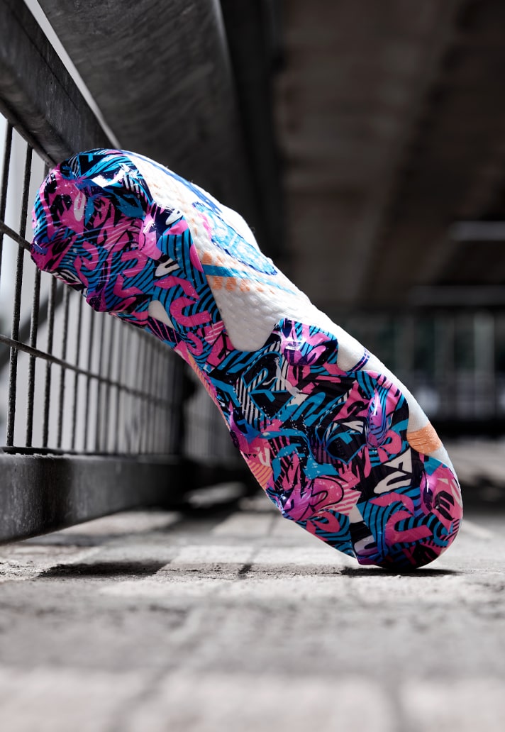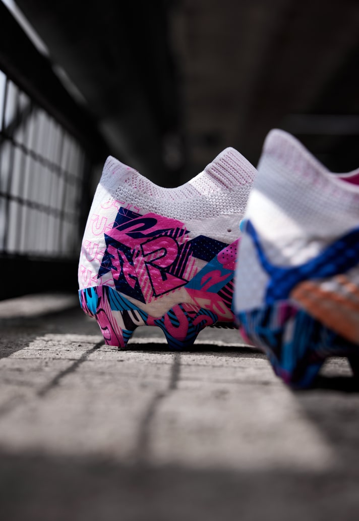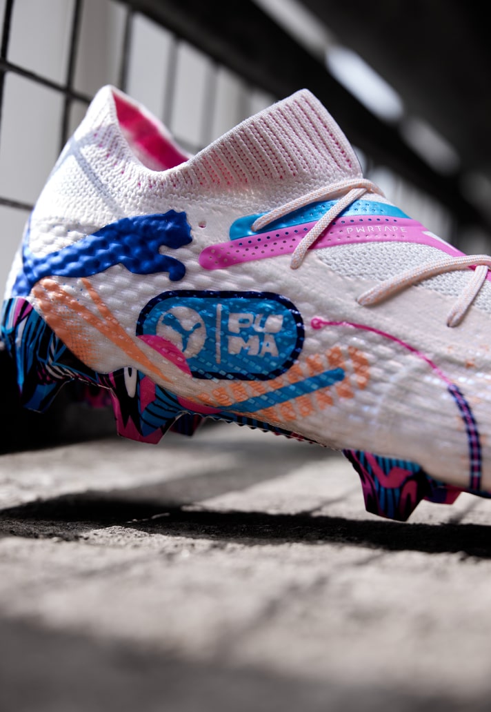 Starting off with the Future, and it arrives in what is an official colourway of “Puma White/Luminous Blue/Poison Pink/Fizzy Melon/Bluemazing”, but as if that even covers the half of it. It’s a visual feast, with the white base acting as a canvas upon which the blues and pinks and oranges play out. But it’s the soleplate that shouts loudest, with a busy graphic design of predominantly blues and pinks.