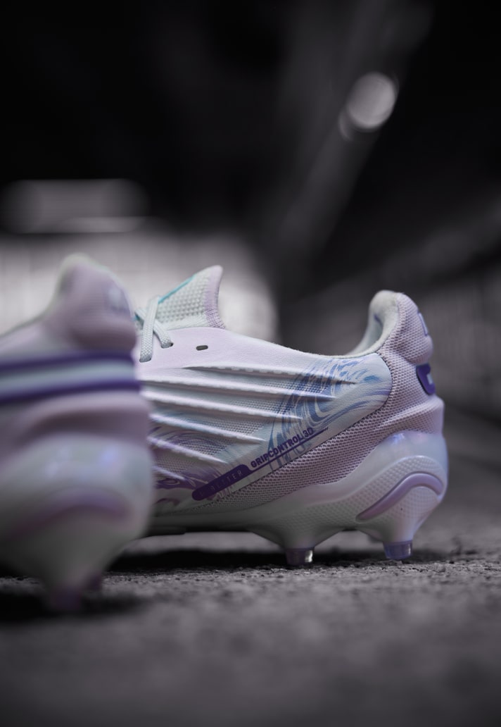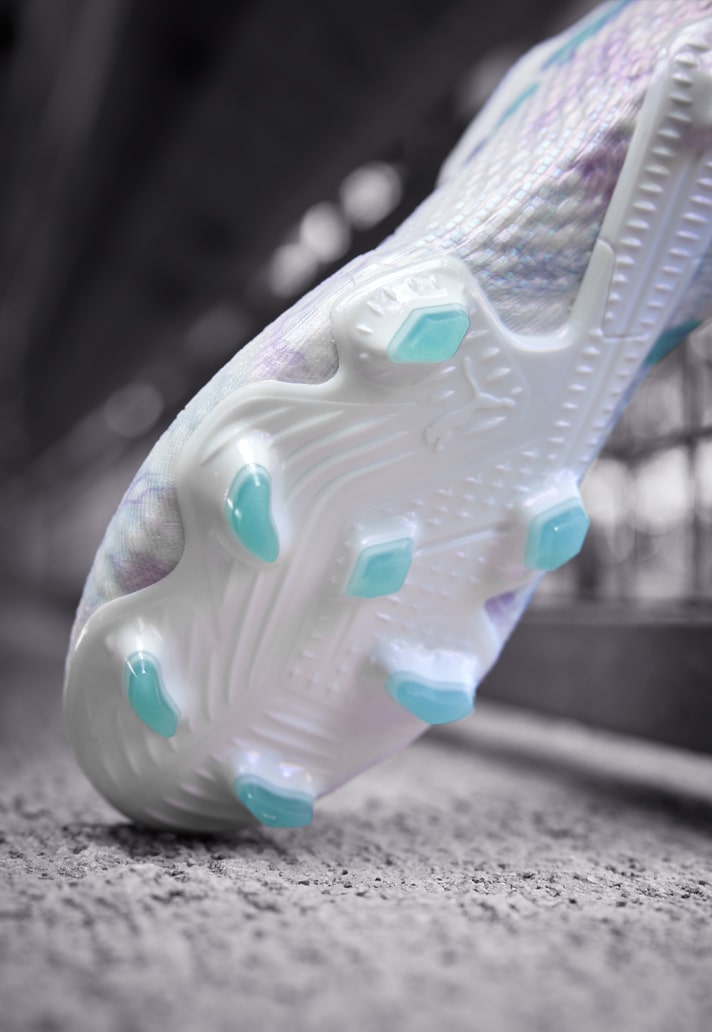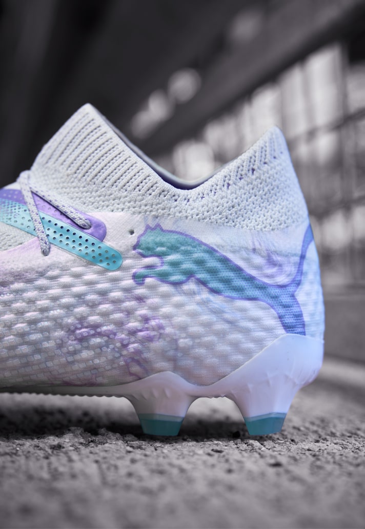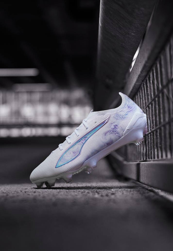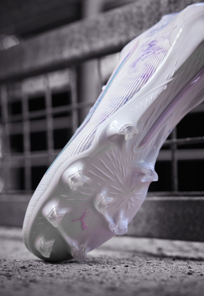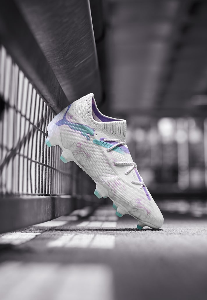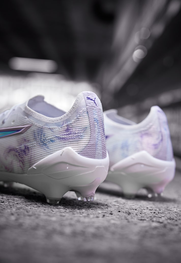 The official colourway used across all three boots is "Puma White/Puma Black/Spring Lavender", and it sees a lighter tone base featuring the lavender graphics swirling throughout the upper.