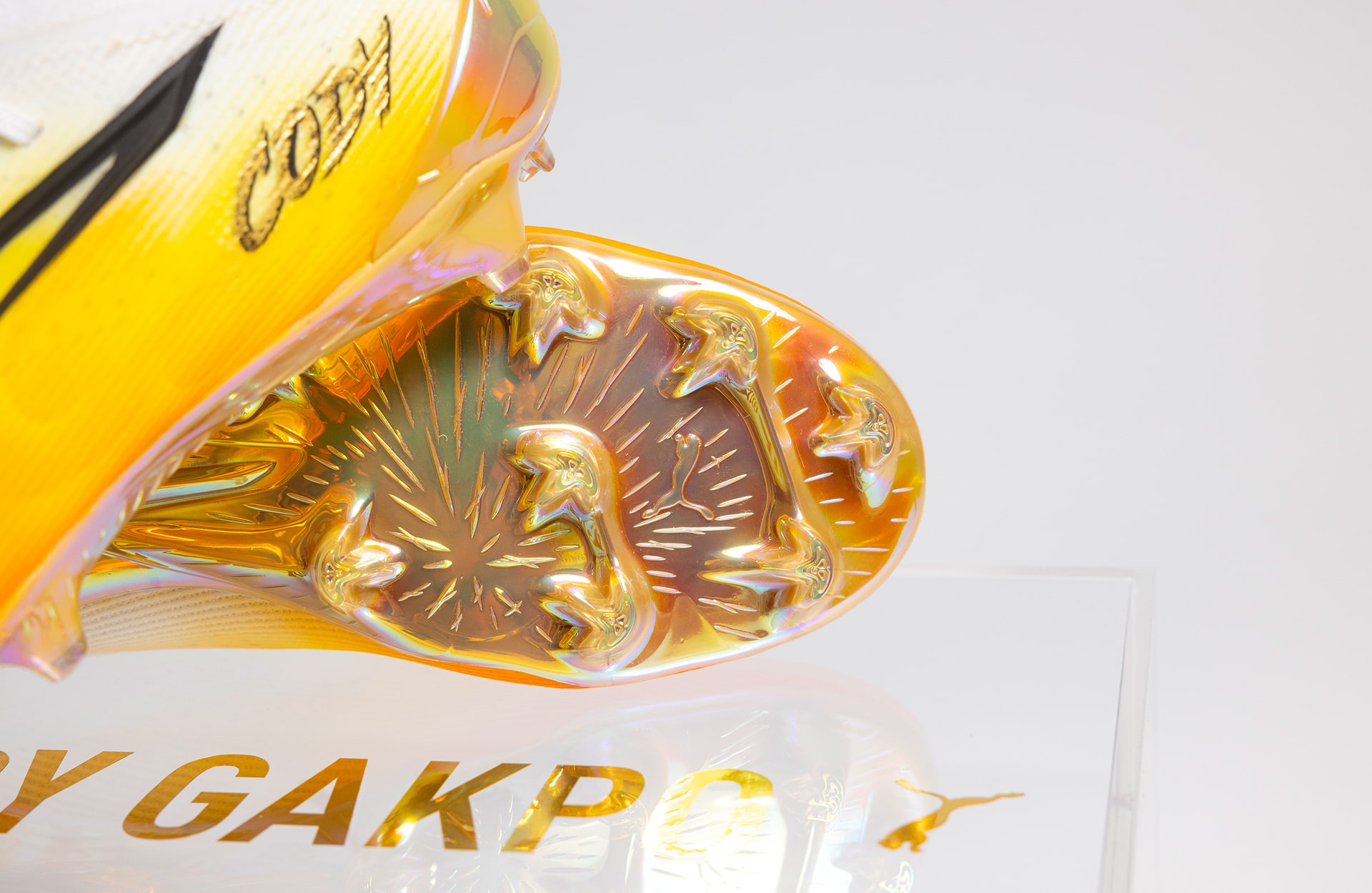 The design see a white base that's dominated by a vibrant yellow/gold burst that rises from the iridescent gold soleplate through the upper. "Cody" appears on the left heel, and "Gakpo" on the right, both in stylised gold font in recognition of the achievement. The branding takes on a contrasting black, with the outline of the brand's famous Formstripe riding down the lateral side of the boots.