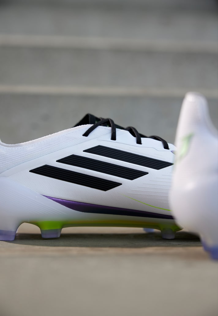 The F50 Triunfo Estelar Elite arrives in a “Ftwr White/Core Black/Unity Purple” colourway, with that white base trimmed by purple. It features the latest F50 technology, so on the underside you’re getting the Sprintframe 360 – a specifically designed soleplate built to provide optimised stability and traction and help facilitate multidirectional speed and acceleration.