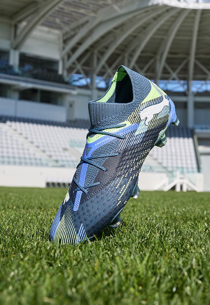 Moving on to the Future 7, and it rocks up in a really impressive “Gray Skies/Puma White/Fizzy Apple” colourway. There aren’t many looks these days that are properly unique for football boots, but this one certainly is. The grey/blue base plays host to graphic overlays of green and lighter blue tones. Tech-wise, the Future 7 is designed with an adaptive FUZIONFIT360 upper that provides the ultimate fit. Combining PWRPRINT, PWRTAPE, engineered dual mesh, and stretchy knit for a snug, supportive fit for 360-degree freedom of movement on pitch.