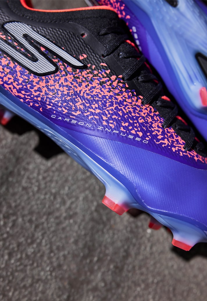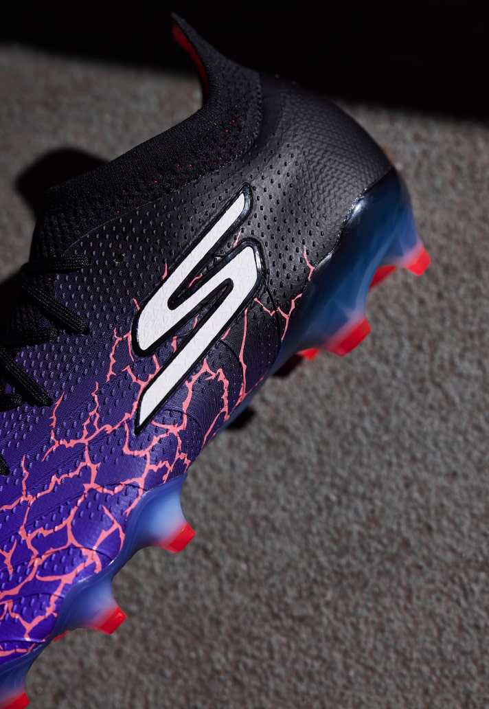 It’s a stark contrast to the smoothness of the Razor’s upper, which is constructed from FitKnit: a combination of knitted back quarter, which offers dynamic support and breathability, and a premium leather-like synthetic in the forefoot, to provide exceptional feel on the ball. That tech is accentuated through the block purple colouring as opposed to the lightning effect across the SKX_01.