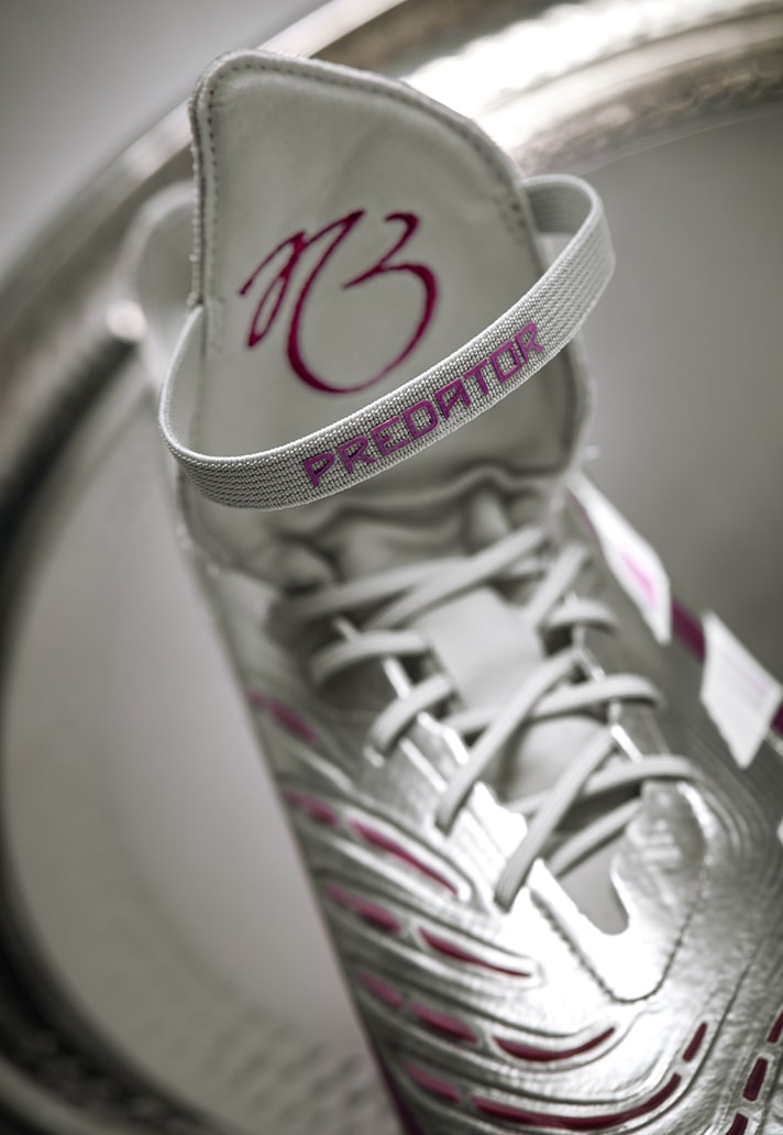 Let’s get into aesthetics. Dishing up a chrome look, the Predator Strikeskin upper is engulfed in a metallic silver base with burgundy modelled across the full tongue as well as subtle accents, creating a polished looking boot. Across the tongue, the distinct ‘JB’ logo features in a crisp white on the right boot, whilst the adidas three stripes logo is stamped onto the left. Nods to Jude can also be spotted within the insole and under the tongue, as well as stamped on the heel where the JB logo is completed with a silhouette of his iconic signature celebration. Burgundy accents cascade across the lateral side of the boots, whilst also fashioning the cutting-edge rubber fins (designed to maximise touch and control). Who knew Burgundy and silver looked so clean together.