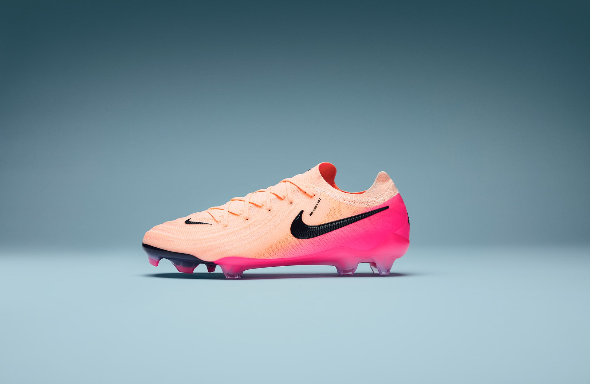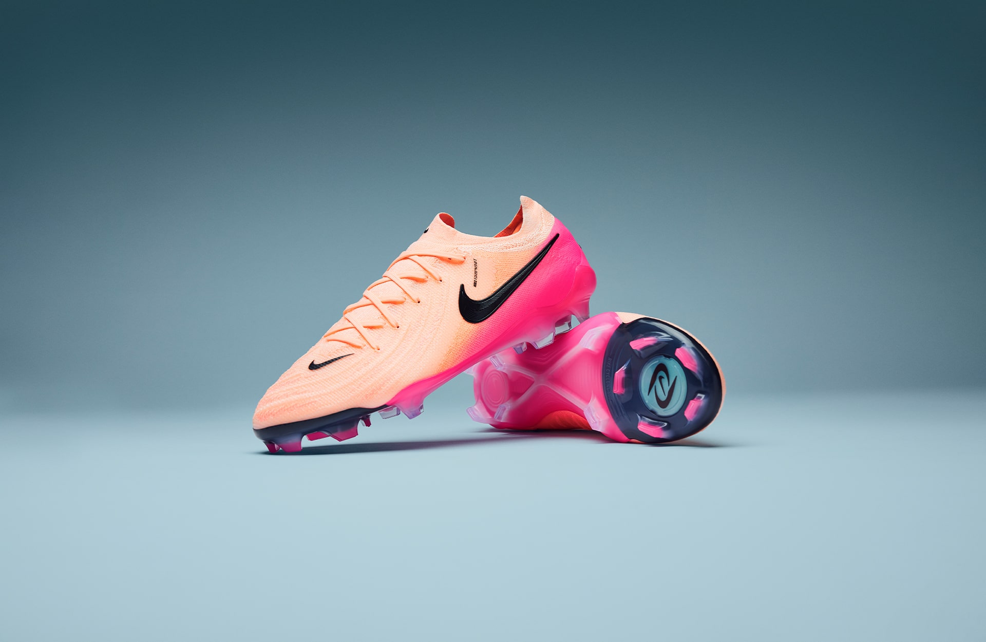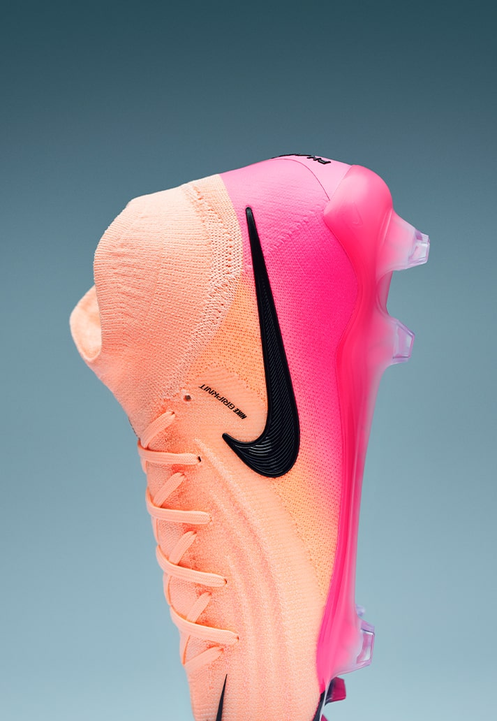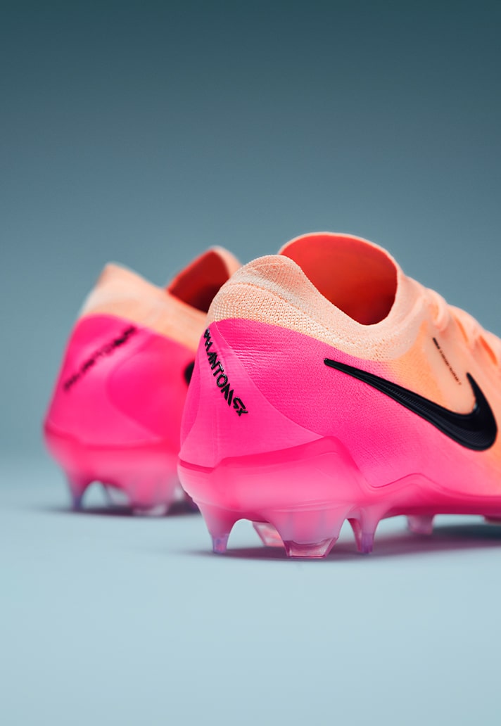 Onto the Phantom GXII, a silo built for precision and touch, and Nike don’t miss the target with these. Moving away from the blue shades seen on the Mercurial, the Phantom fashions a “Crimson Tint/Black/Pink Blast” colourway, again spotlighting the pastel colours as the headline act. A ‘peachy’ look engulfs the knit upper, whilst fading into a bright pink that wraps around the heel. The Nike Swoosh stands bold in black, a clear and strong presence. The pink continues along the soleplate, as well as styling the studs on the modern Cyclone 360 technology.