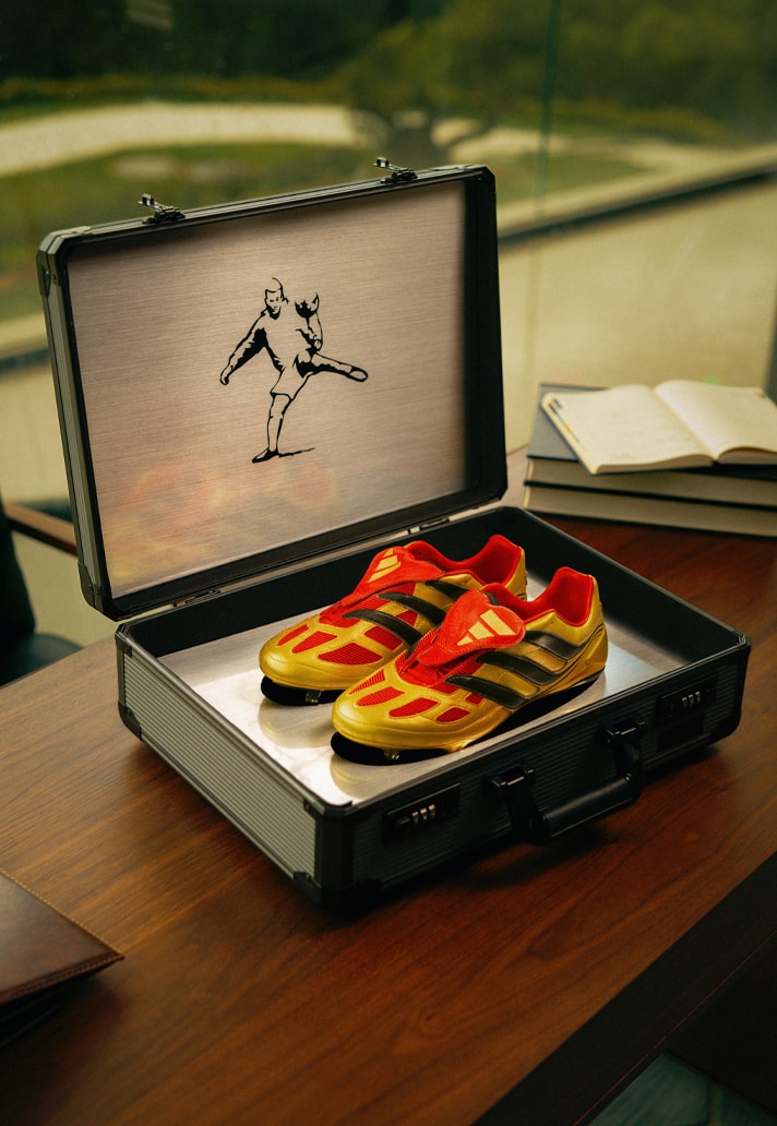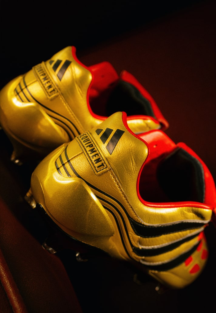 Bathed in a regal “Gold Met/Black/Collegiate Red” colourway, this latest iteration of the Predator Precision was teased back in January of this year, and it arrives as a gold-drenched nod to the original pair gifted to Zinedine Zidane when he was named World Player of the Year back in 2000. Reimagined with pinpoint accuracy, the upper sticks closely to the OG spec, mirroring the aesthetics of the boot that lit up pitches at the turn of the millennium. Black Three Stripes crash diagonally across the golden vamp in that instantly recognisable Precision fashion, while that iconic red fold-over tongue once again takes its place like a crown atop the foot.