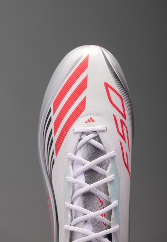 For those with sharp eyes and sharper memories, the aesthetic of the Prestig10 boots will instantly ring bells. Inspired by the iconic F50 Tunit from 2007–2009, the design reimagines a cult classic for the modern era. The black wave graphic cascading through the upper recalls those golden days of early Messi, while bold red Three Stripes at the toe punch through the white and silver base with contemporary energy. It’s vintage recharged—heritage made high-tech.