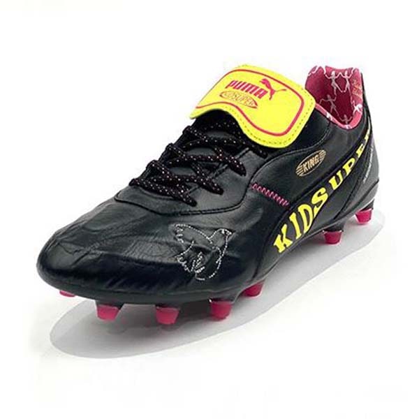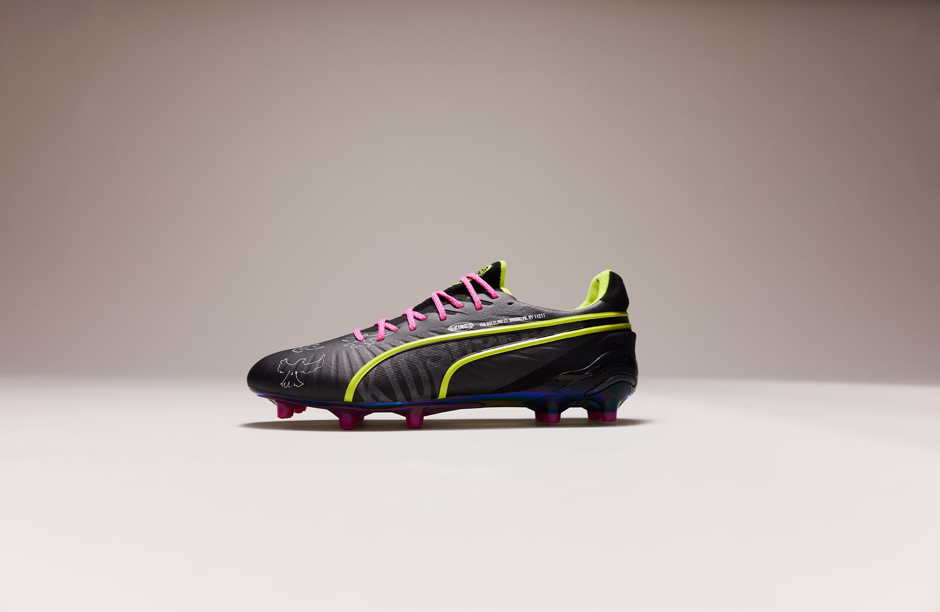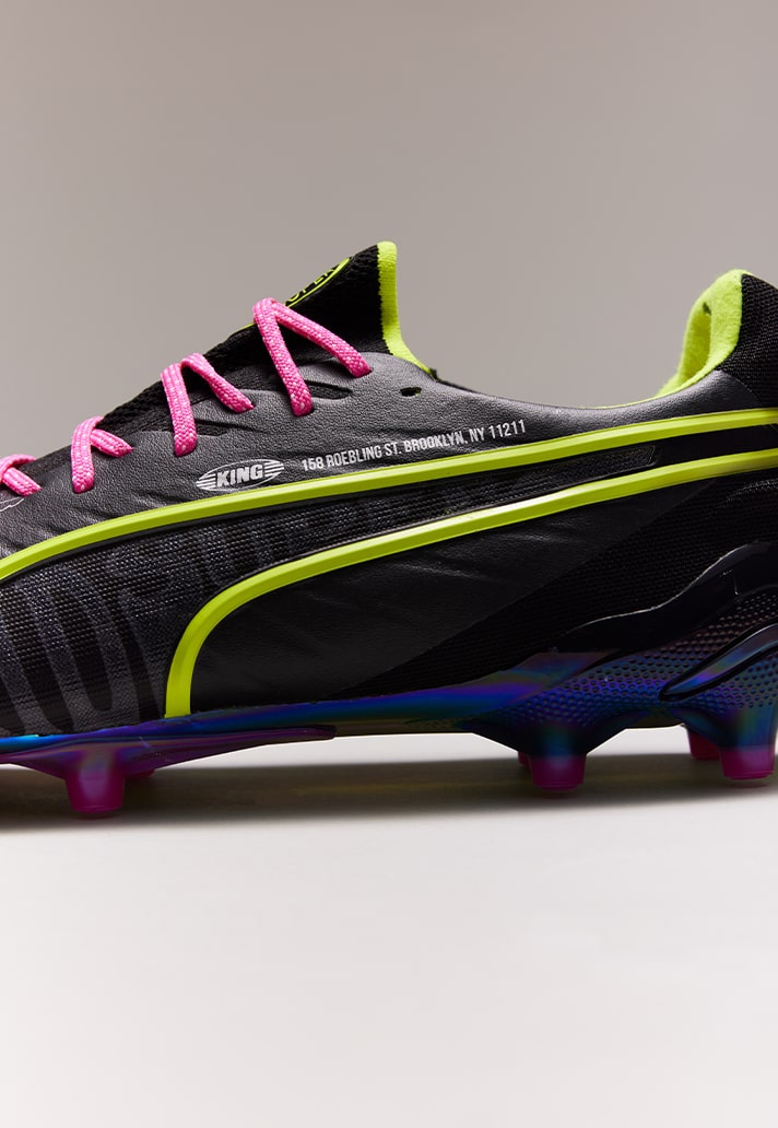 Last but definitely not least, the King. A timeless silo, worn by some of the greatest players to ever play the beautiful game. This drop sees the King become less traditional and a lot more visionary. A black base, elevated with pops of pink and lucid yellow accents. ‘King’ is sketched across the instep in the boldest way possible, whilst the form strip takes a more subtle approach with a yellow border. The boot is finished with small bird graphics on the upper as well as the address of the KidSuper studio in New York. All three silos are stamped with a ‘KidSuper Football Club’ sign off on the heel, designed with a bespoke badge to complete the collaboration.