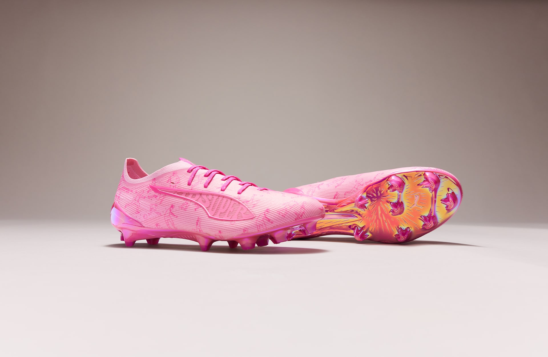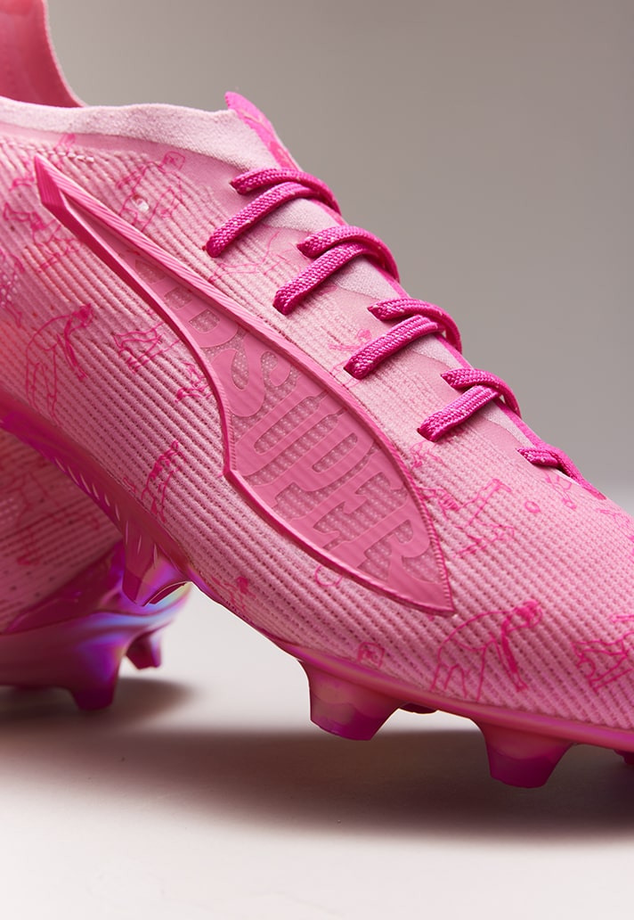 Onto the Ultra, a boot embodying speed and flair. They knew what they were doing with this one. We are talking an all-pink boot – pink upper, pink laces and a pink soleplate. The iconic form stripe, so well-known on a PUMA boot, is reimagined with KidSuper branding, whilst small graphics of characters playing football feature all over the upper. We can’t miss a shoutout to the soleplate, it is a thing of beauty. A pink outsole wrapped in a chrome finish – can’t go wrong.