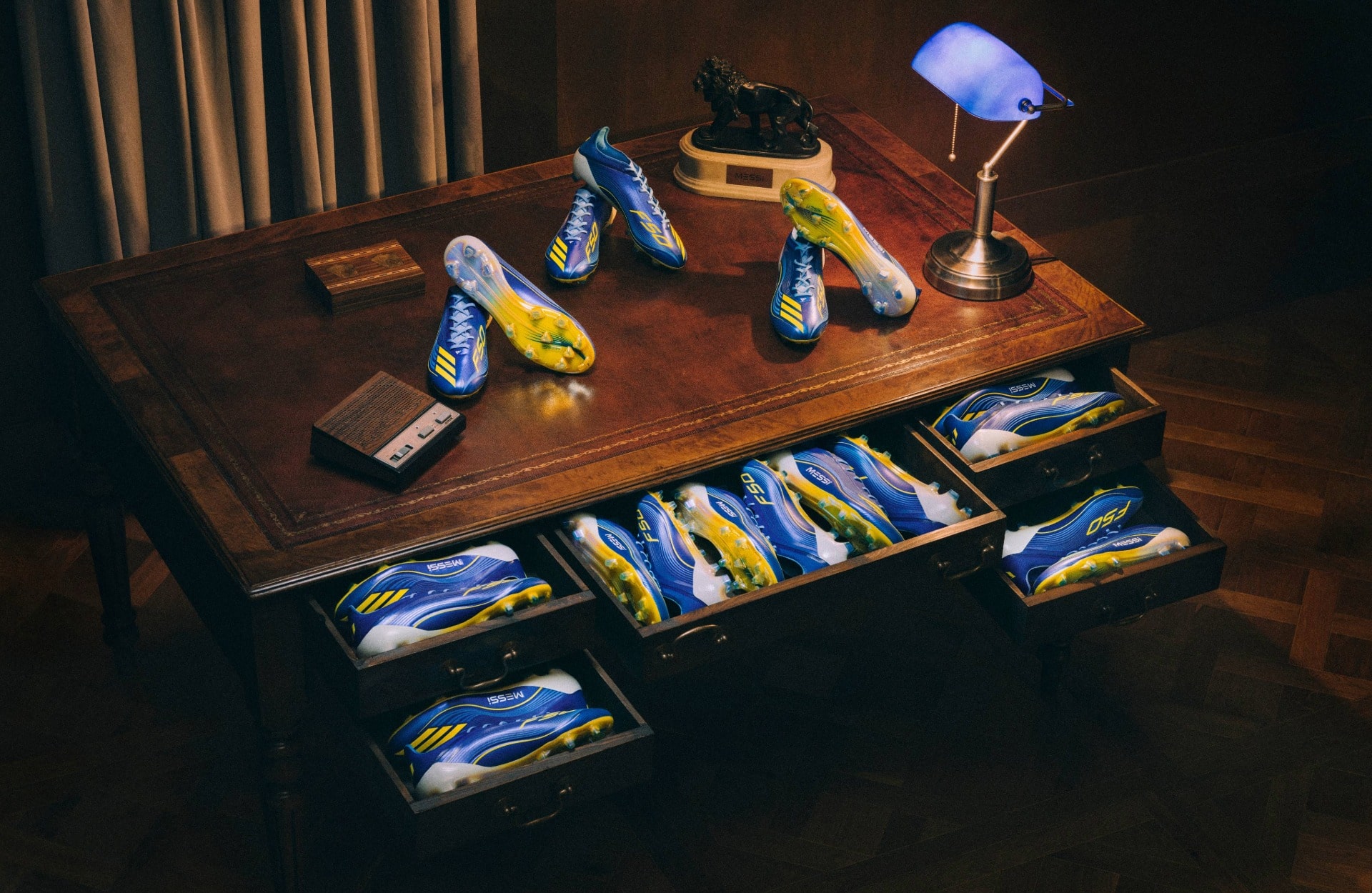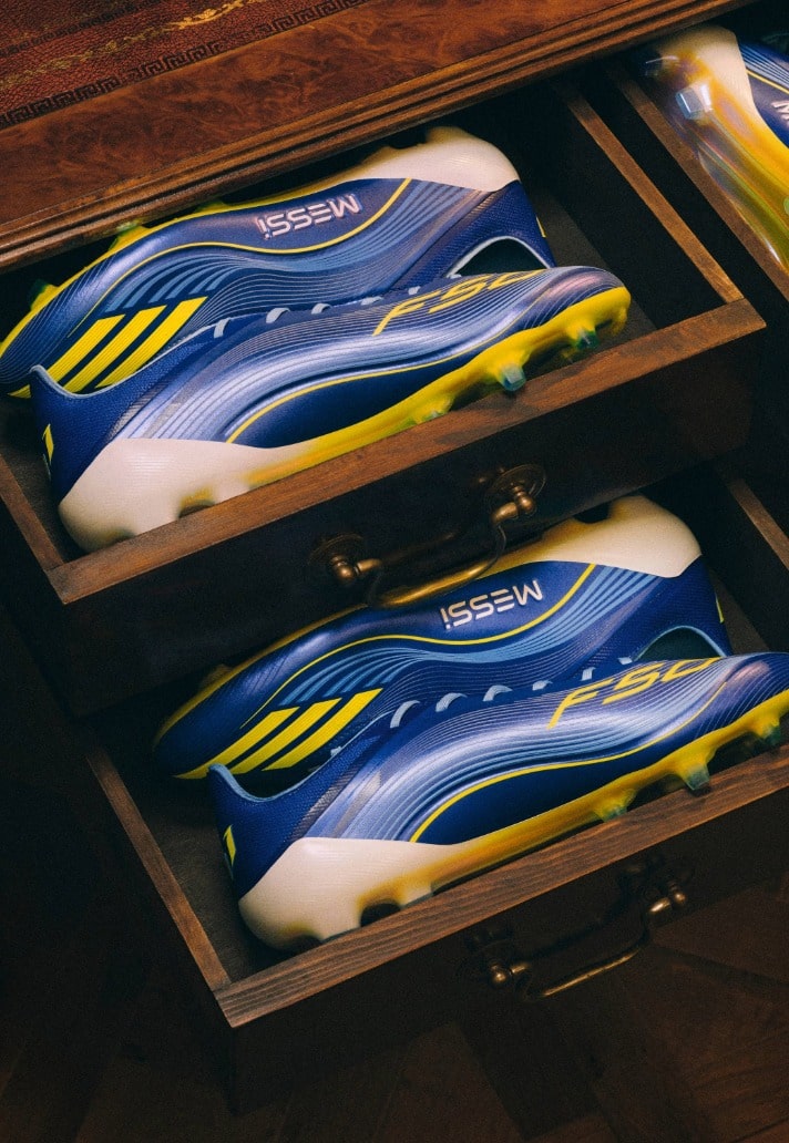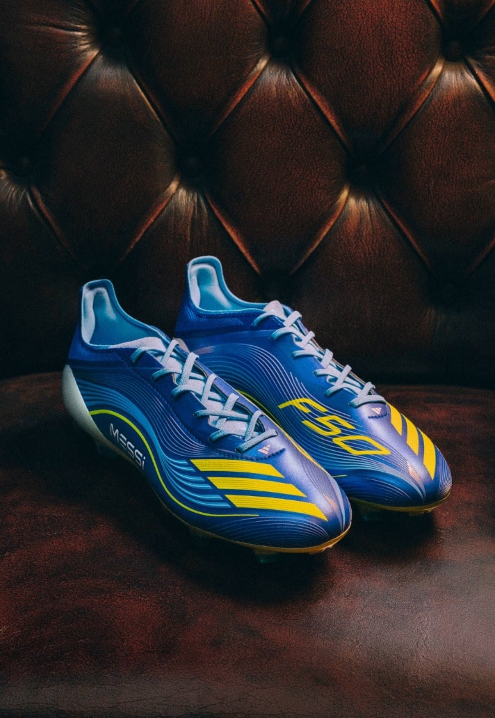 The design leans into Messi’s footballing foresight, arriving in a sharp look that blends the past with the present. A Royal Blue base is animated with flowing waves of Blue Burst, capped off by three bold Solar Yellow stripes at the toe. Flip them over and you’ll find a yellow soleplate that bleeds into white through a gradient fade — a nod to speed and lightness. The colourway carries subtle echoes of the F50i Messi signature edition from 2009, connecting eras of a career that continues to defy time.