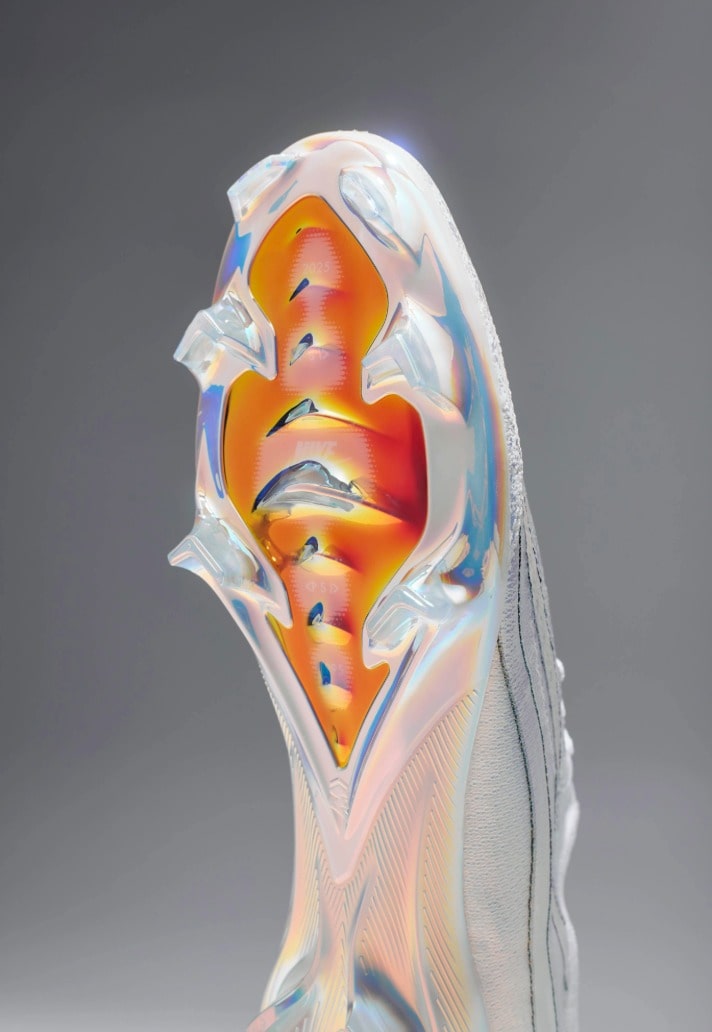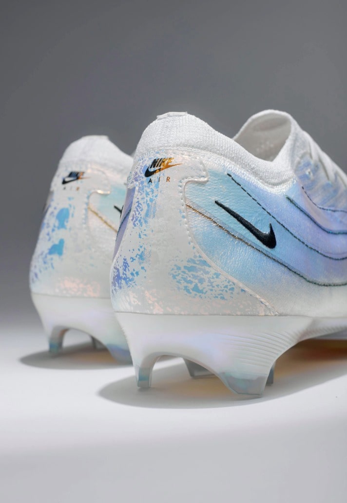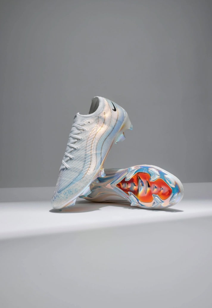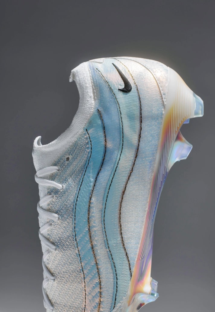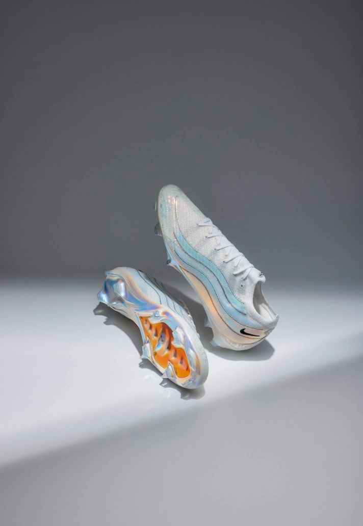 The boot once again leans heavily into sneaker heritage, with the Mercurial silhouette taking direct cues from Sergio Lozano’s legendary Air Max 95. The latest edition sees the Vapor 16 reimagined through the lens of the street-loved sneaker, with Nike layering a pristine all-white Flyknit upper with a design that mirrors the AM95 signature wave pattern. Iridescent accents flow through the sides, shifting colour under the light to give the boots that futuristic edge that look simply stunning. Underneath the action, the soleplate takes a subtle centre stage. Treated with a rainbow-sheen iridescent finish, it comes with a bold orange underlay, creating a striking contrast against the pristine white of the rest of the boot.