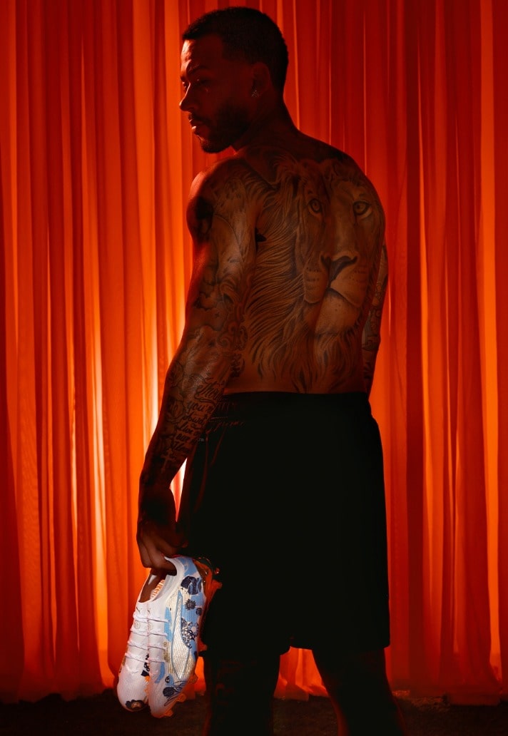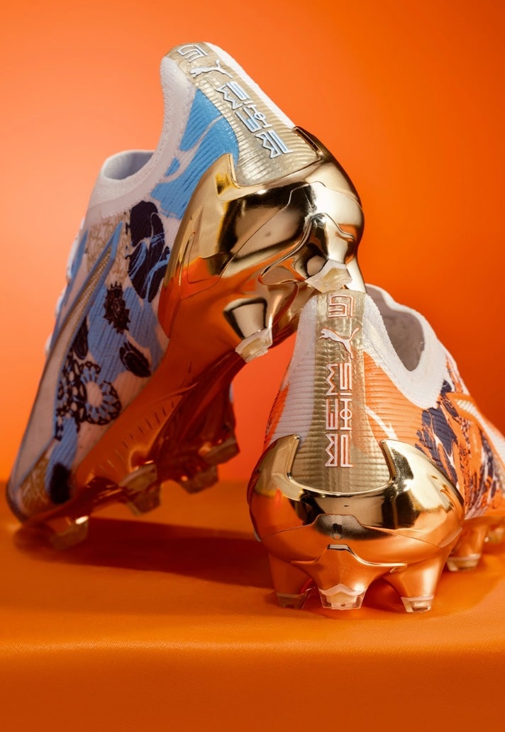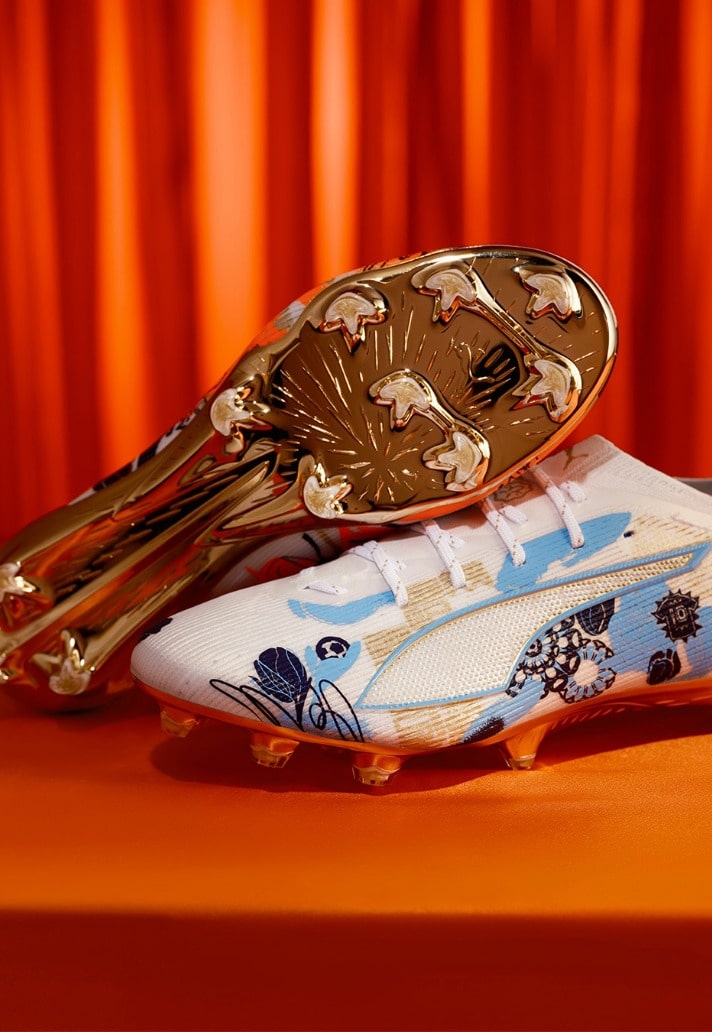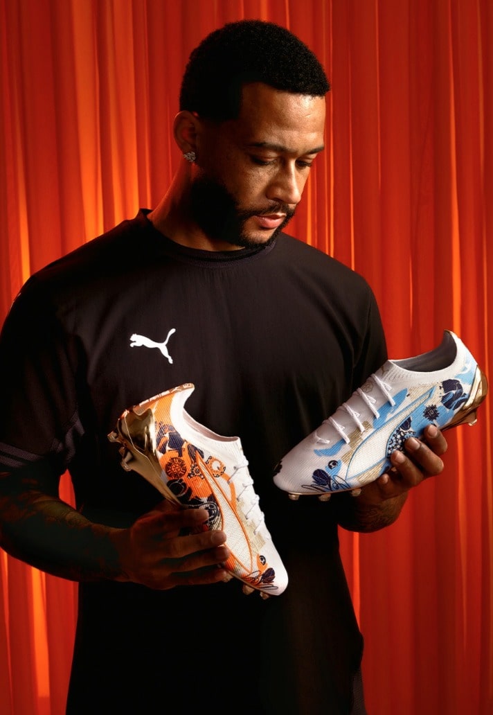 The boots themselves are as layered as Memphis’ career. Built on a white base, each boot carries its own distinct narrative in contrasting colourways. The left boot, painted in blue and black, highlights family, faith and culture. The right, in orange and black, tells the story of footballing milestones and moments that defined his journey.