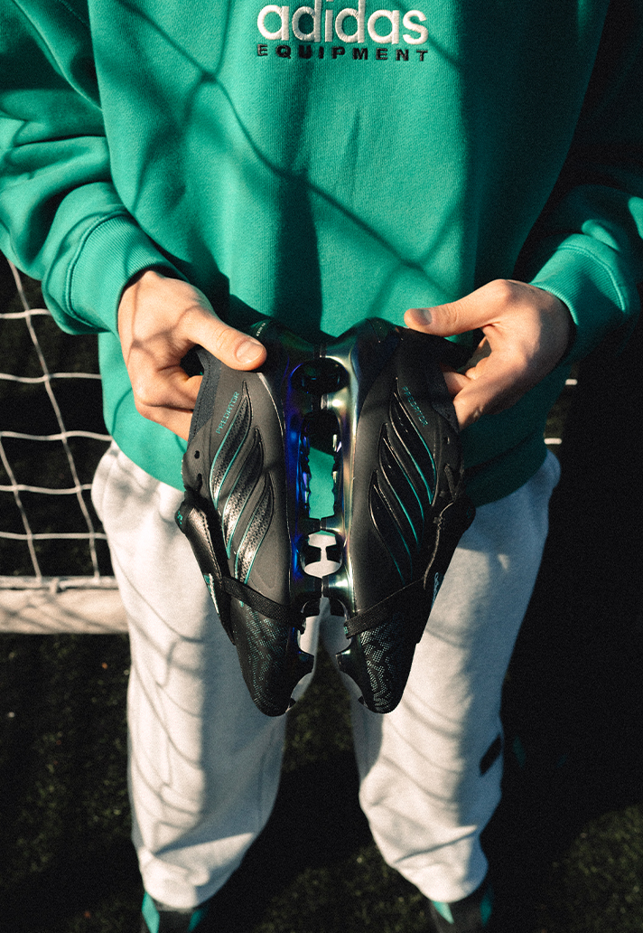 The predominantly black upper gives the boot a stealth‑leaning presence, creating a platform for the EQT Green – arguably one of the most iconic adidas colours ever produced – to punch through in all the right places. Most notably, it sits proudly on the signature fold‑over tongue. Look to the heel and you’ll find the classic “adidas EQUIPMENT” logo stamped clean and confident – a detail that cements the retro inspiration while giving the boot an authenticity purists will appreciate. It’s a small touch, but it carries real weight; a reminder of a time when football boots weren’t just gear, but part of a player’s identity.