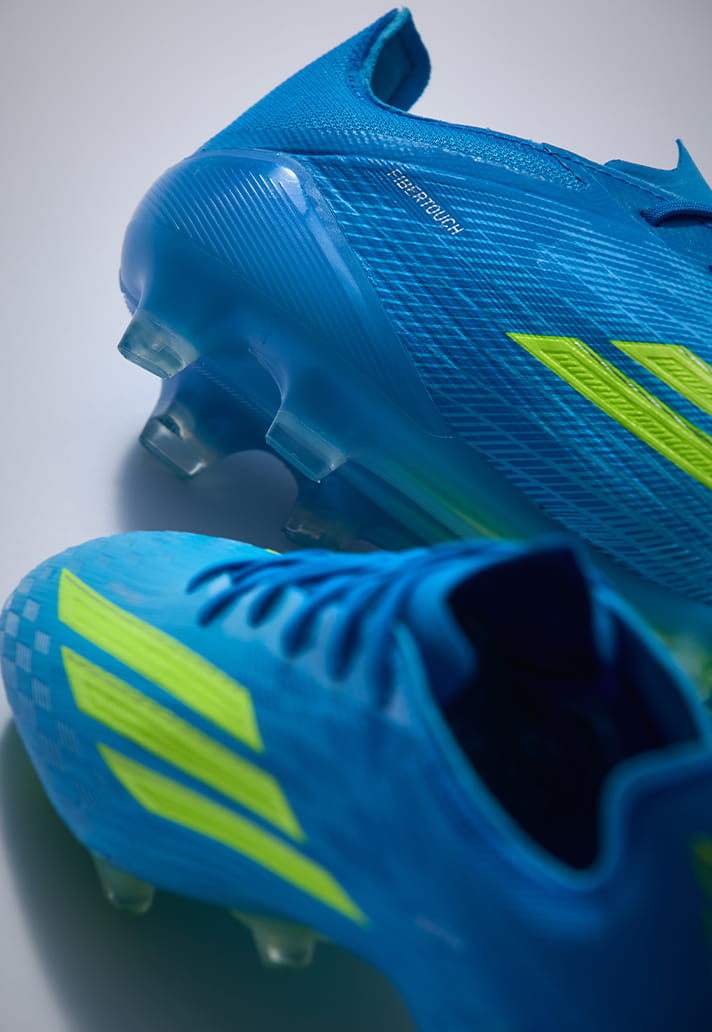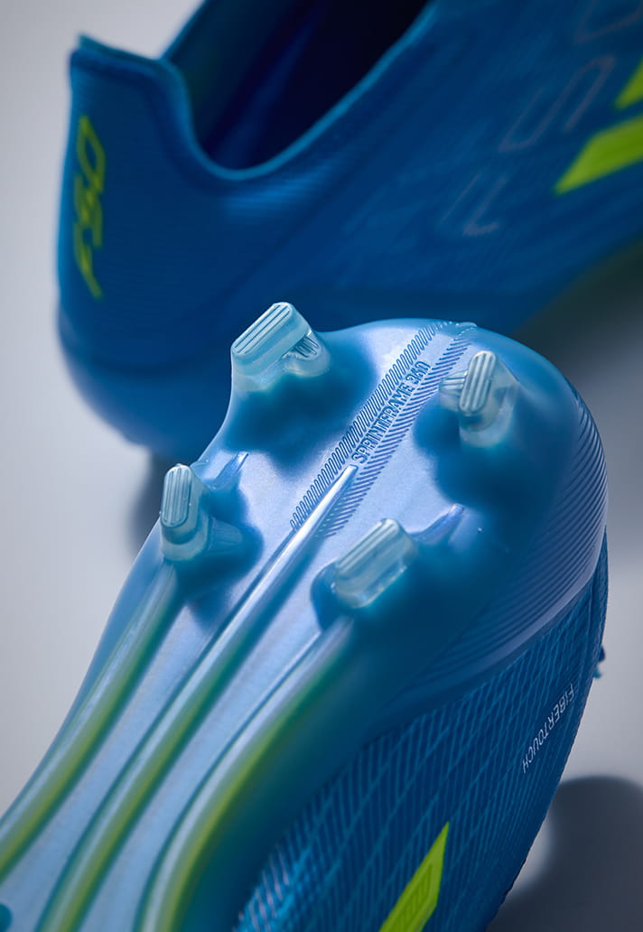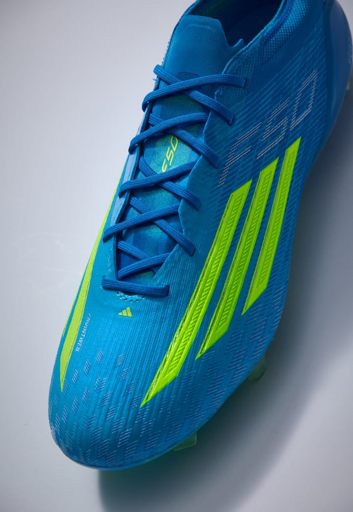 The new F50 Elite, dressed in “Lucid Ray Blue/Team Solar Yellow/Lucid Aquamarine,” showcases an electric blue upper highlighted by neon green three stripes. Its FIBERTOUCH UPPER delivers targeted cushioning and lightweight support, complemented by SPRINTWEB – a high-definition 3D texture that improves ball control.