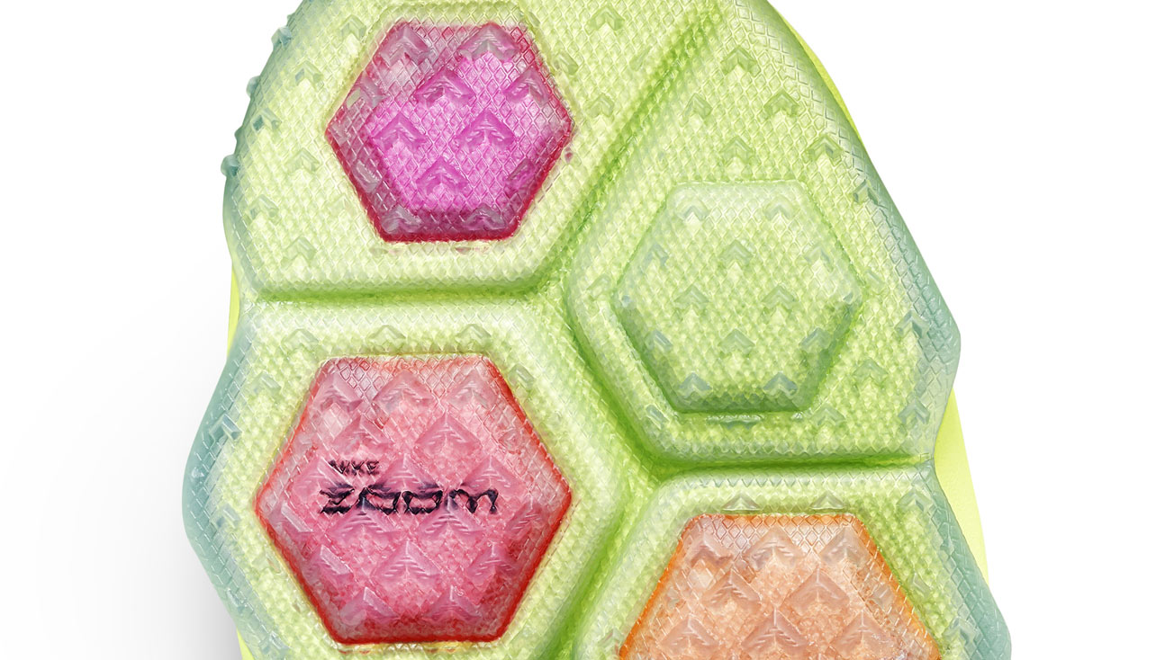 The most exciting feature though is the all-new Hex-Zoom cushioning system. Hexagonal Nike Zoom Air utilizes nature's strongest shape, the hexagon, to give designers the ability to use pressure mapping to place the Zoom cushioning where it best serves the athlete — the forefoot. The focus for maximum cushioning typically has been in the heel but this new application serves the athlete who spends more time pivoting and exploding during intenese training exercises.