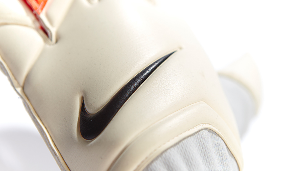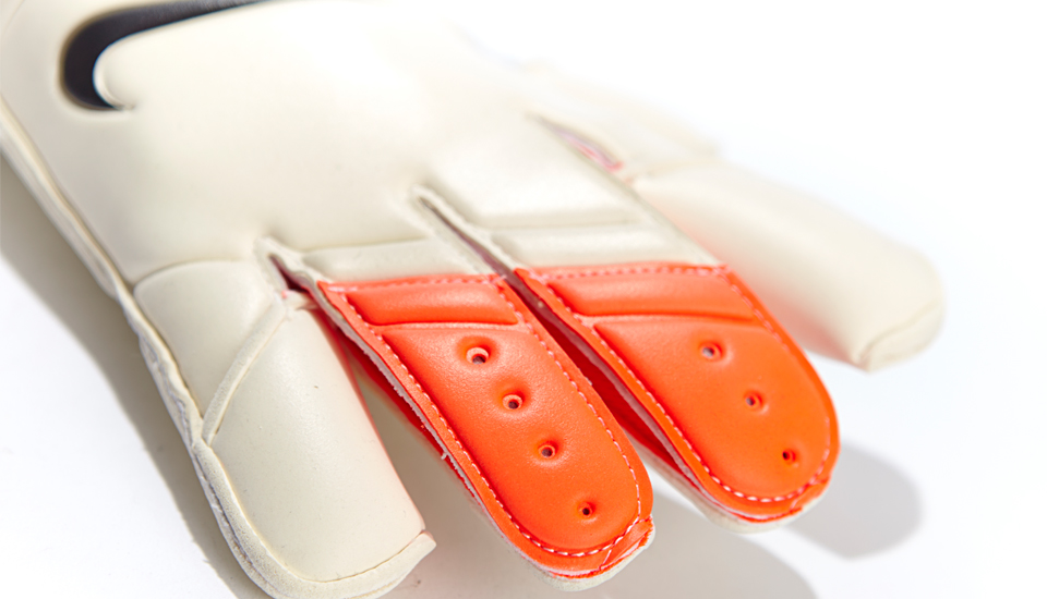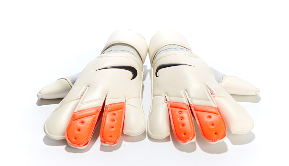 The new gloves are mainly white with a diagonal orange tips on the middle and ring fingers. Featuring Nike's patented Vapor Grip3 technology whereby latex wraps around the thumb, forefinger and pinky, the gloves maximize grip and control with no seams between your fingers and the ball.